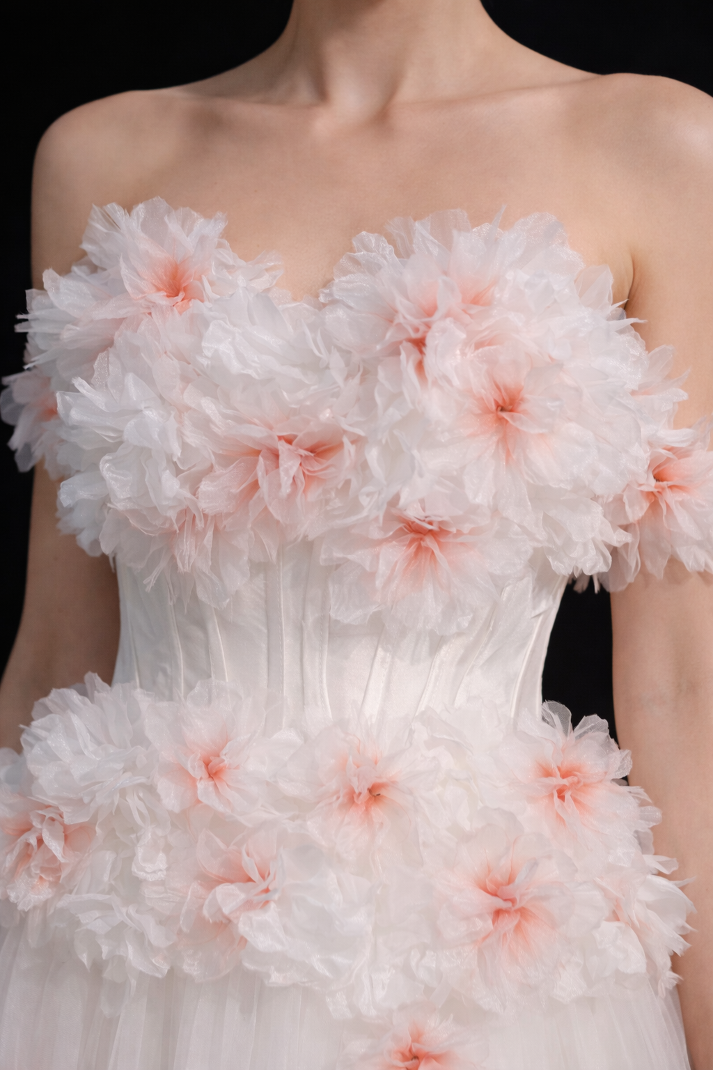 A dreamy ivory gown adorned with delicate floral appliqués and a flowing tulle silhouette, designed to capture timeless romance and graceful elegance....