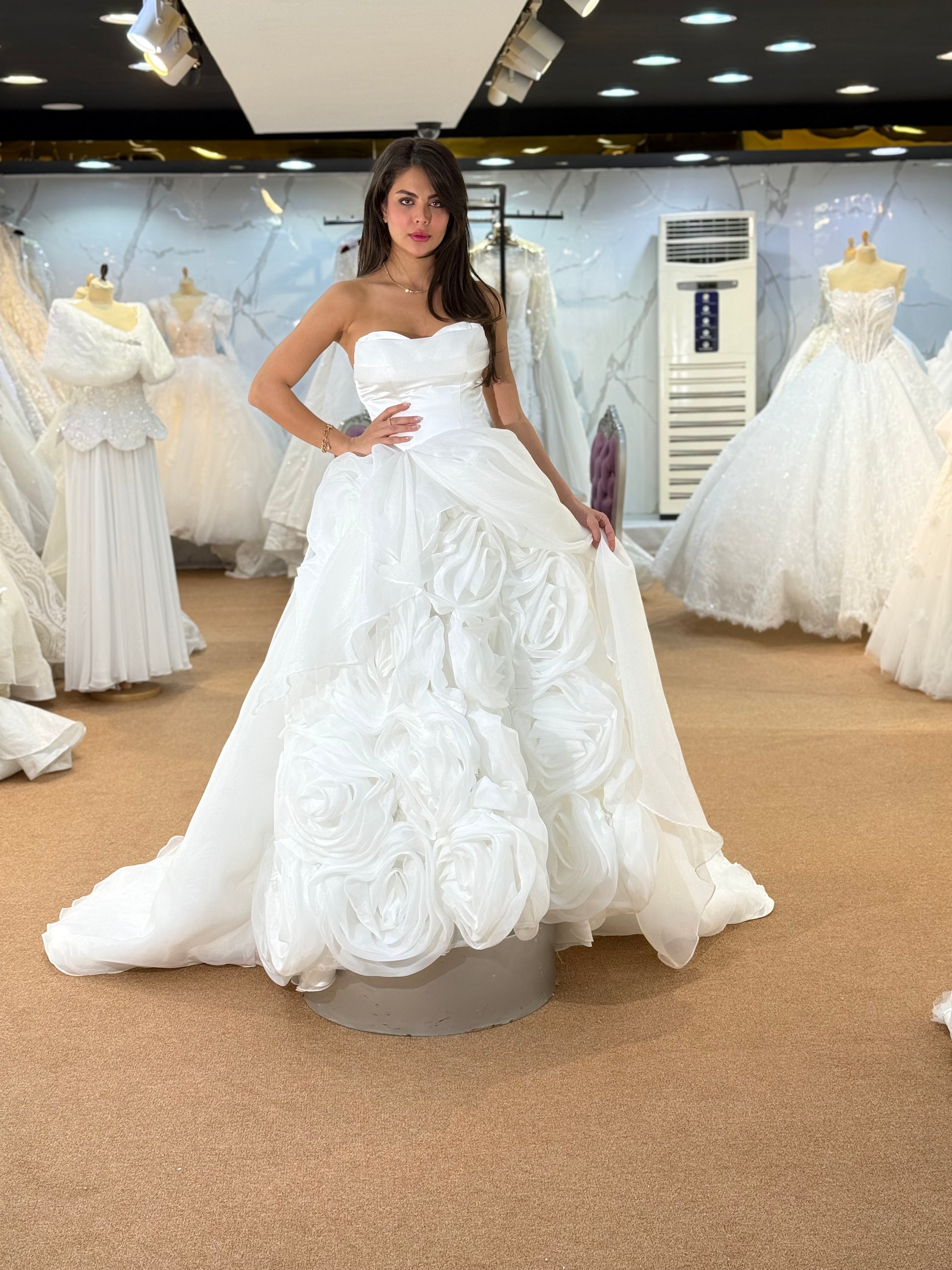 This elegant strapless bridal gown features a sculpted bodice and a dramatic floral-textured skirt for a luxurious and romantic look. Perfect for brides who want timeless elegance with a statement finish....