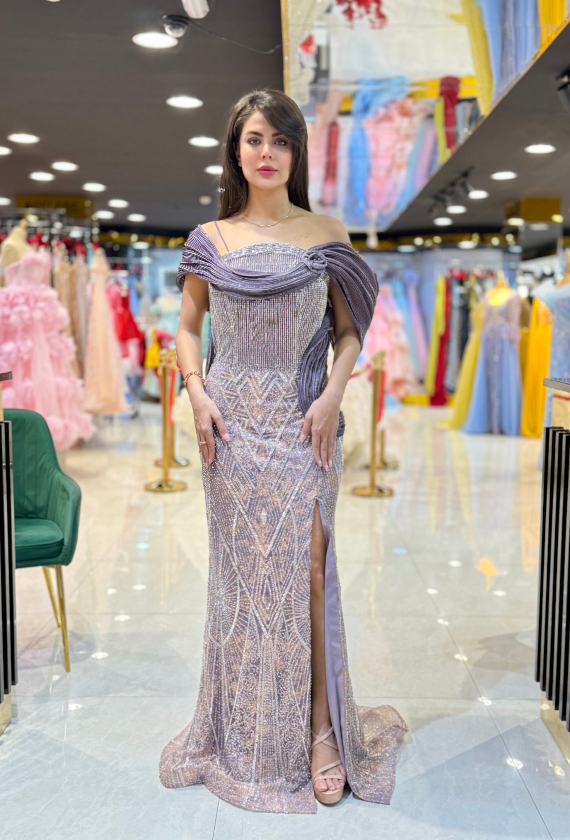 An elegant evening gown featuring intricate shimmering embellishment, a refined off-shoulder draped neckline, and a graceful front slit. Designed to enhance the silhouette with timeless sophistication, this piece is perfect for formal evenings and special occasions