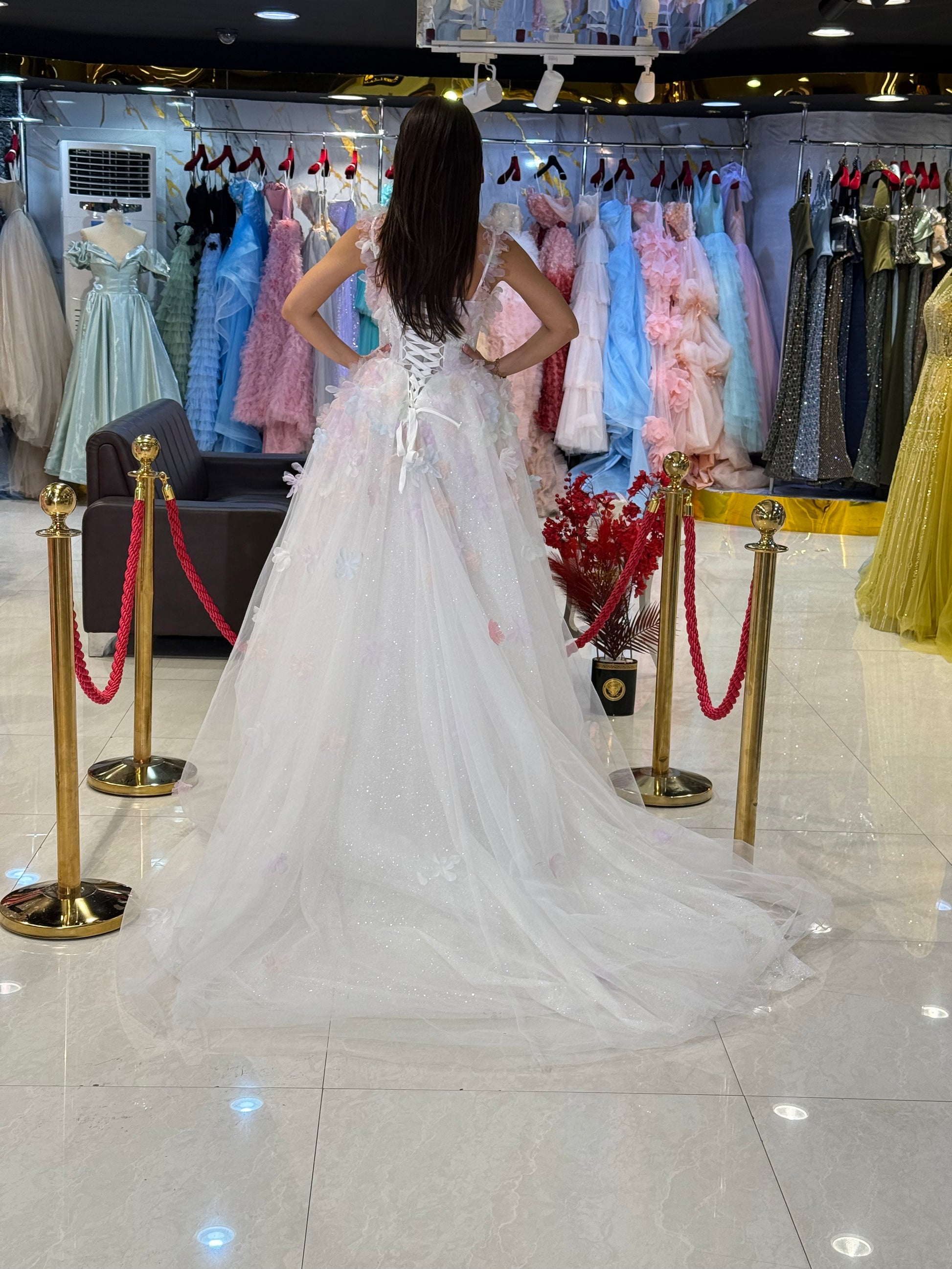 A beautiful white prom dress with soft flower details and a light tulle skirt. Comfortable to wear and easy to move in, this dress gives a clean, elegant look...