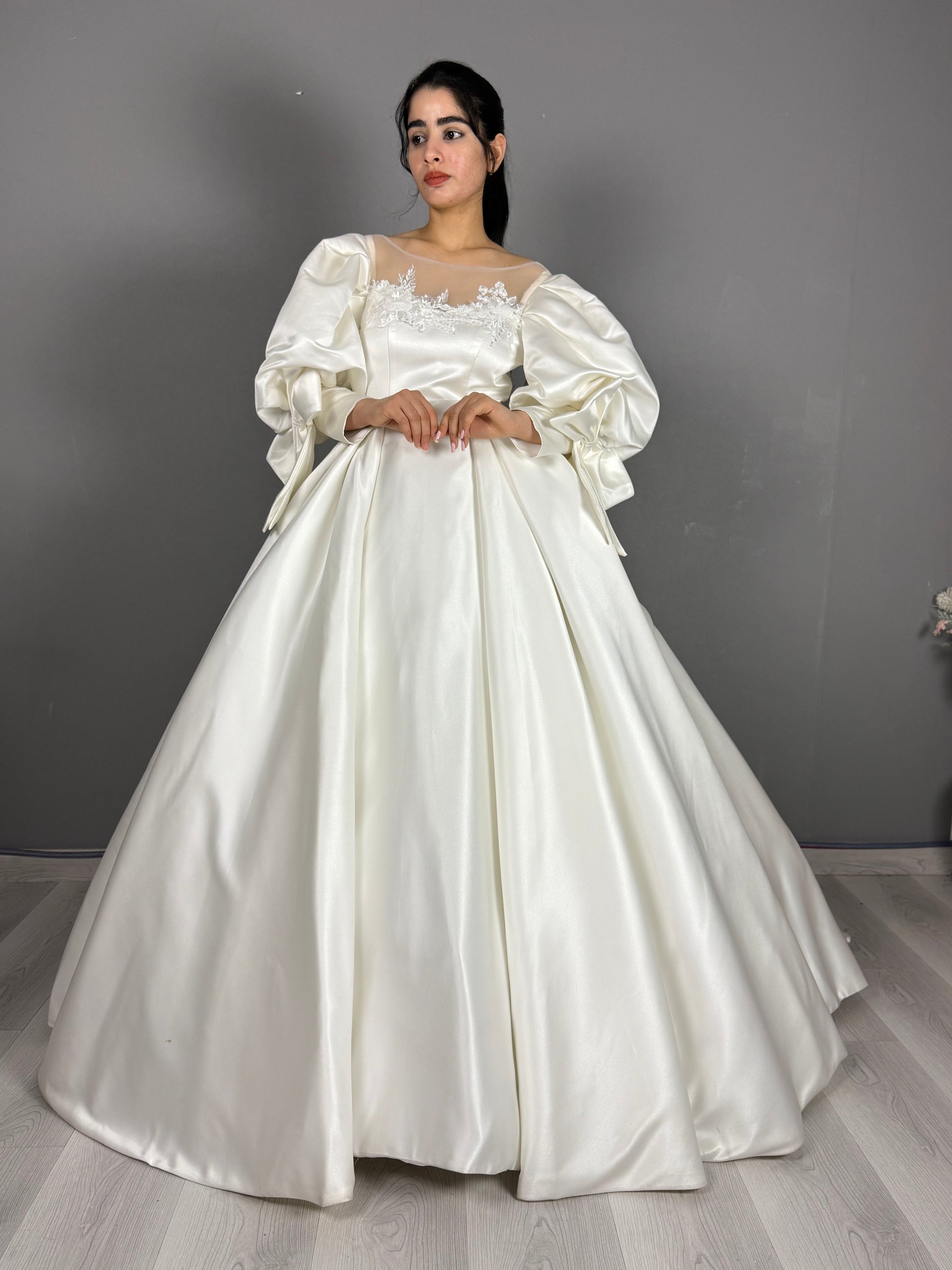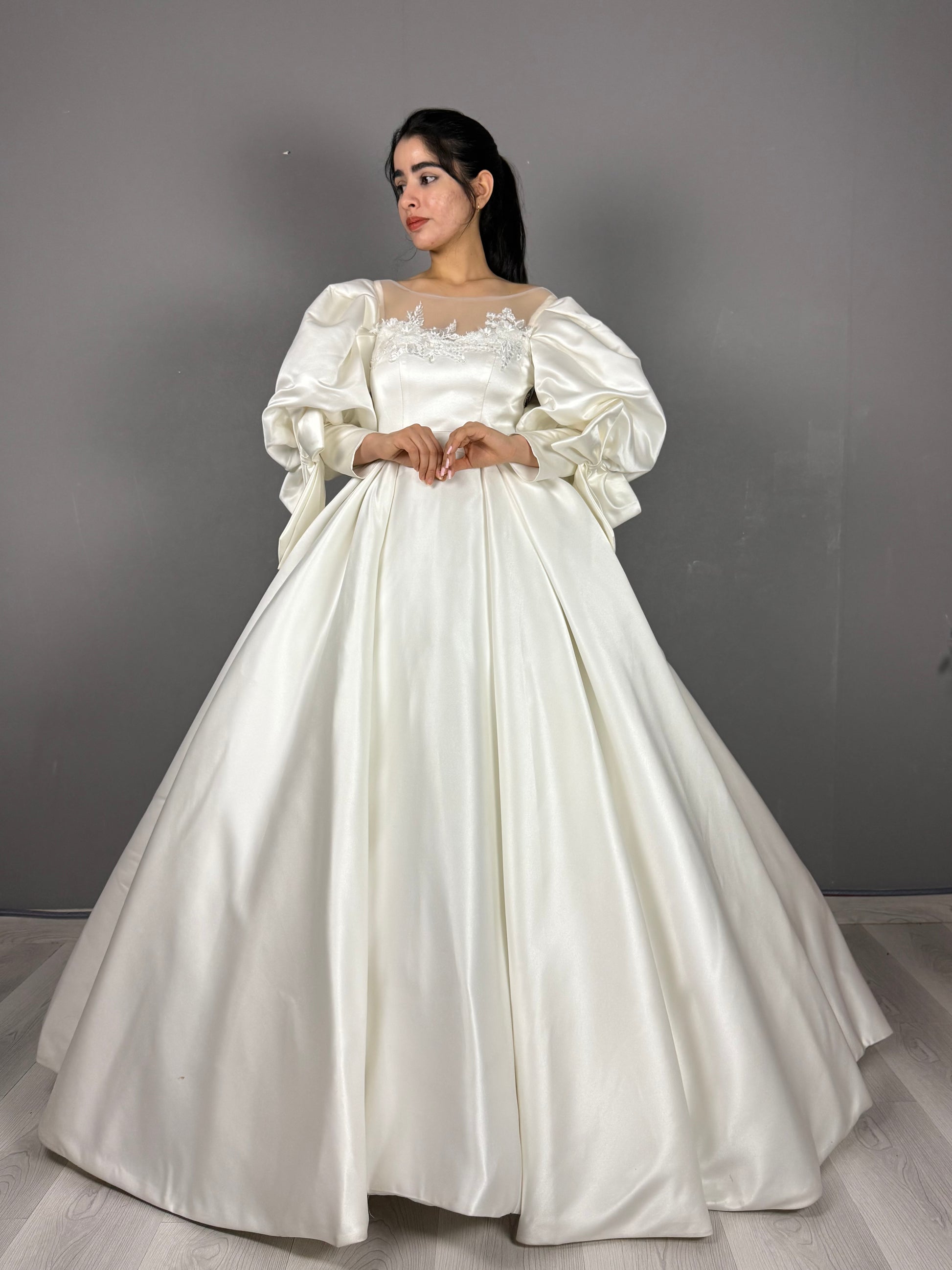 A graceful satin ball gown featuring a refined lace-trimmed neckline, dramatic puff sleeves, and a voluminous skirt, designed for a timeless and regal bridal look.... Free Size: Customization available.